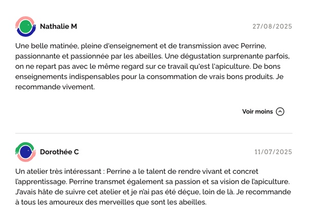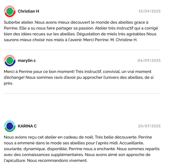 Au terme de cet atelier, vous repartirez avec le plein de connaissances apicoles, un mémo des miels aquitains à garder précieusement, et un petit pot surprise de miel local que vous vous amuserez à reconnaitre à la maison.
